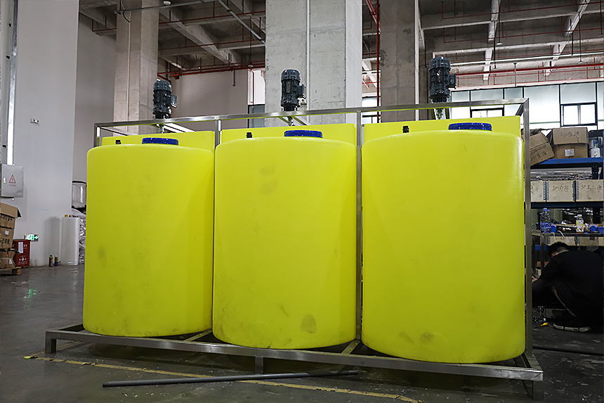 成套加药装置将粉状药剂或液体药剂定量输送至溶液箱,同时启动搅拌装置对溶液箱内的溶液进行搅拌,然后开启溶液箱下部的阀门,使溶液自流至计量泵的入口处,再由计量泵根据设定需求将溶液输送到投加点,其投加量由全自动控制系统通过变频控制系统或电动冲程控制系统对计量泵的流量进行控制。在计量泵的出口管路口处设有逆止阀、压力表、流量补偿器以及安 全溢流阀等零部件,使计量泵的药剂投加可靠。加药装置通过高精度在线水质检测设备,跟 踪水质变化,并控制加药泵自动实时定量添加药剂,使出水达到工艺需要的水质标准。
