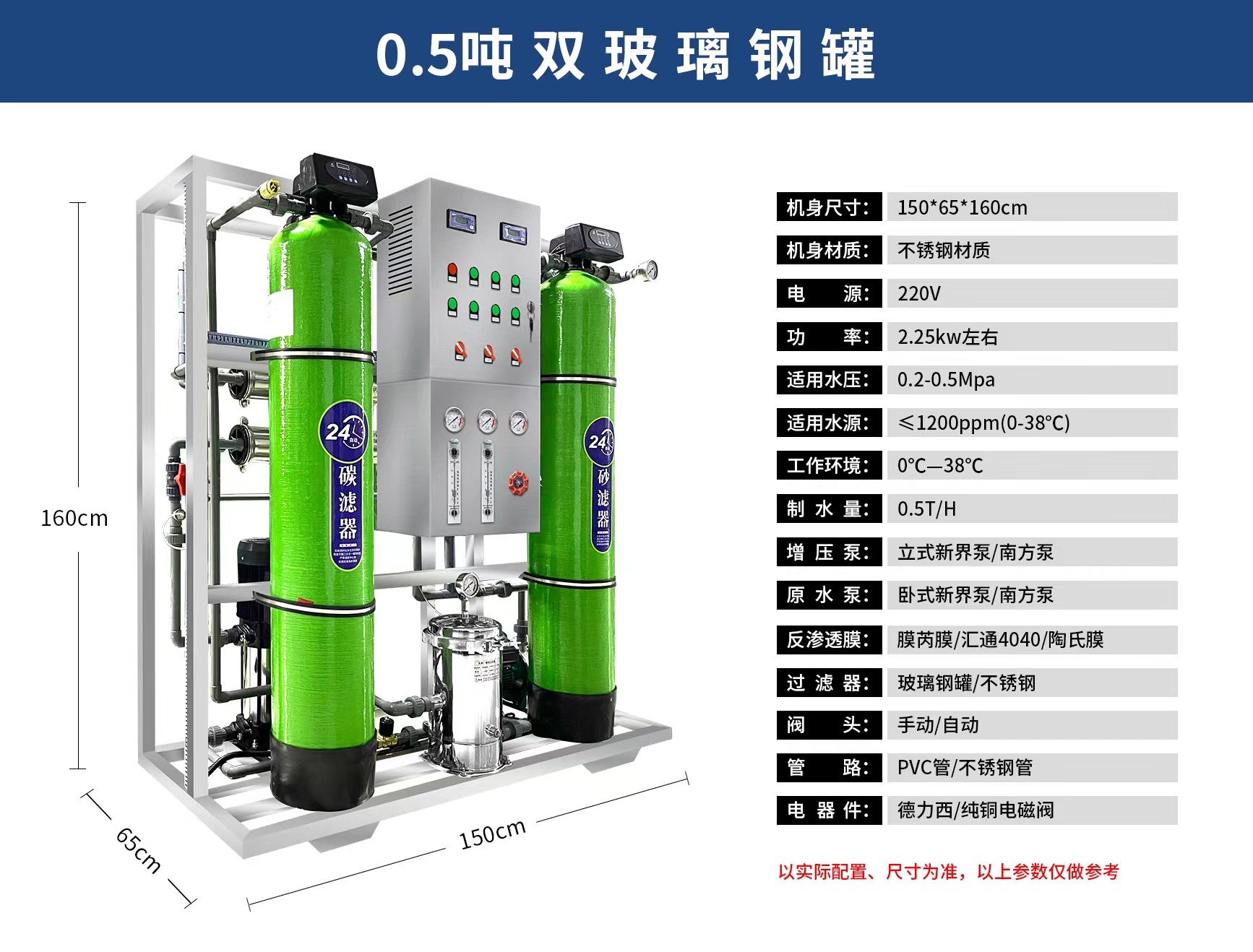 - 原水要求:井水→原水箱→增压泵→砂滤器→炭滤器→软化器→保安过滤器→高压泵→一级RO膜→增压泵→二级RO膜→储水箱→增压供水