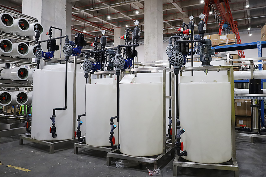 成套加药装置将粉状药剂或液体药剂定量输送至溶液箱,同时启动搅拌装置对溶液箱内的溶液进行搅拌,然后开启溶液箱下部的阀门,使溶液自流至计量泵的入口处,再由计量泵根据设定需求将溶液输送到投加点,其投加量由全自动控制系统通过变频控制系统或电动冲程控制系统对计量泵的流量进行控制。在计量泵的出口管路口处设有逆止阀、压力表、流量补偿器以及安 全溢流阀等零部件,使计量泵的药剂投加可靠。加药装置通过高精度在线水质检测设备,跟 踪水质变化,并控制加药泵自动实时定量添加药剂,使出水达到工艺需要的水质标准。